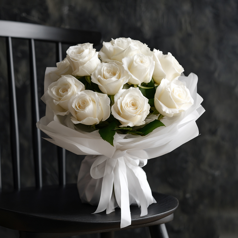 This bouquet, centered around pure white roses, resembles a graceful and poetic expression of elegance, offering a unique and captivating visual experience. Each white rose is carefully selected, with layered petals that unfold like silk beneath moonlight, radiating a soft and noble aura. These pristine blossoms not only convey purity and serenity, but also tell a story of sincerity, sacredness, and timeless devotion.